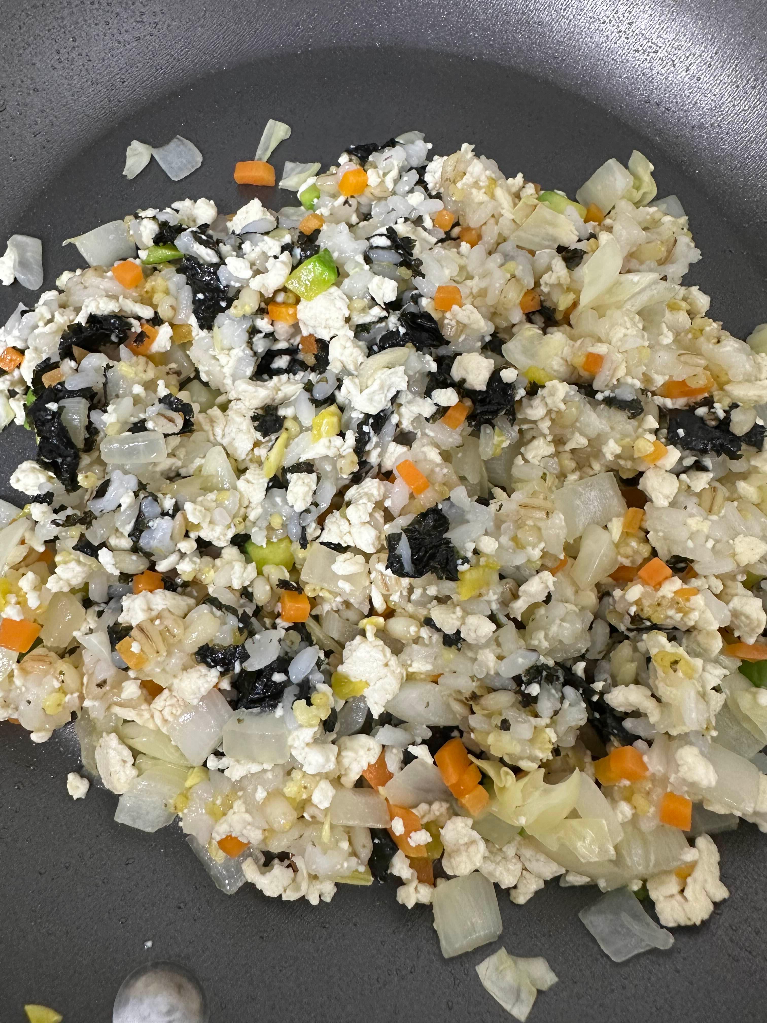 따뜻한 밥을 넣고 두부·채소와 섞으며 볶습니다. 불을 살짝 높여 밥알이 뭉치지 않도록 풀어주세요.